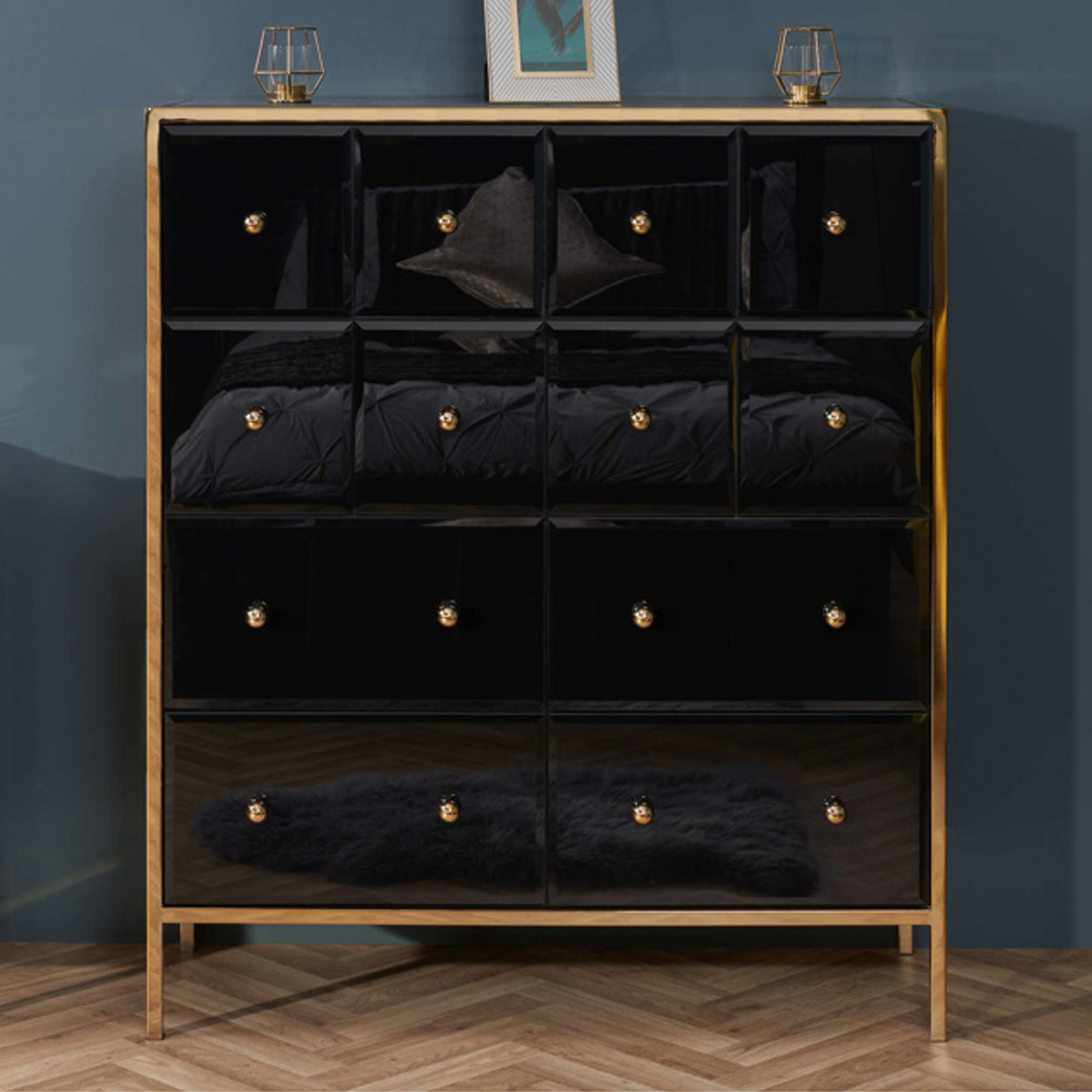 Finback Black Glass Chest Of 12 Drawers With Gold Frame