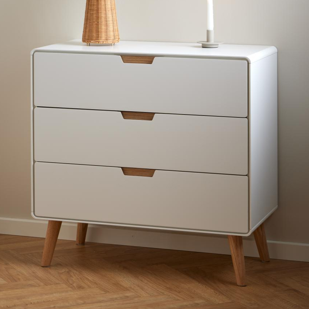 Add a touch of modern elegance to your bedroom or living space with the Furniture in Fashion Lincoln Wooden Chest of 3 Drawers in White and Oak. Combining the timeless appeal of natural oak with a crisp white finish, this chest of drawers brings a fresh and stylish look to any room. Its clean lines and contrasting colours create a versatile piece that effortlessly complements contemporary and classic interiors alike. Designed with both style and functionality in mind, the Lincoln chest offers three spacious drawers that provide ample storage for clothes, accessories, or household essentials. Crafted from durable materials and finished with attention to detail, this chest ensures long-lasting use while keeping your space organized and clutter-free. The Furniture in Fashion Lincoln Wooden Chest of 3 Drawers is a perfect blend of style and practicality. Its sleek white and oak design, combined with generous storage, makes it an essential addition for a well-organized and stylish home. FEATURES : Material : Wooden Finish : White And Oak This spacious 3-drawer chest of drawers provides ample storage for your clothes, toys, and books The white-painted drawer will match almost every room with its minimalistic appeal The oak details complement well the overall aesthetics It is a storage solution that effortlessly blends functionality and design Spacious chest of drawers with ample storage Features 3 drawers with soft close White-painted drawers with oak handle detail Tapered oak legs Three spacious drawers offer practical storage solutions Sturdy wooden construction ensures durability and reliability Smooth drawer glides for easy and quiet operation Compact yet functional design ideal for bedrooms, hallways, or living rooms Clean, minimalist lines that suit a variety of decor styles Easy to maintain surface for lasting beauty and functionality Available at an affordable price Images shown are for illustration purpose only DIMENSIONS : H